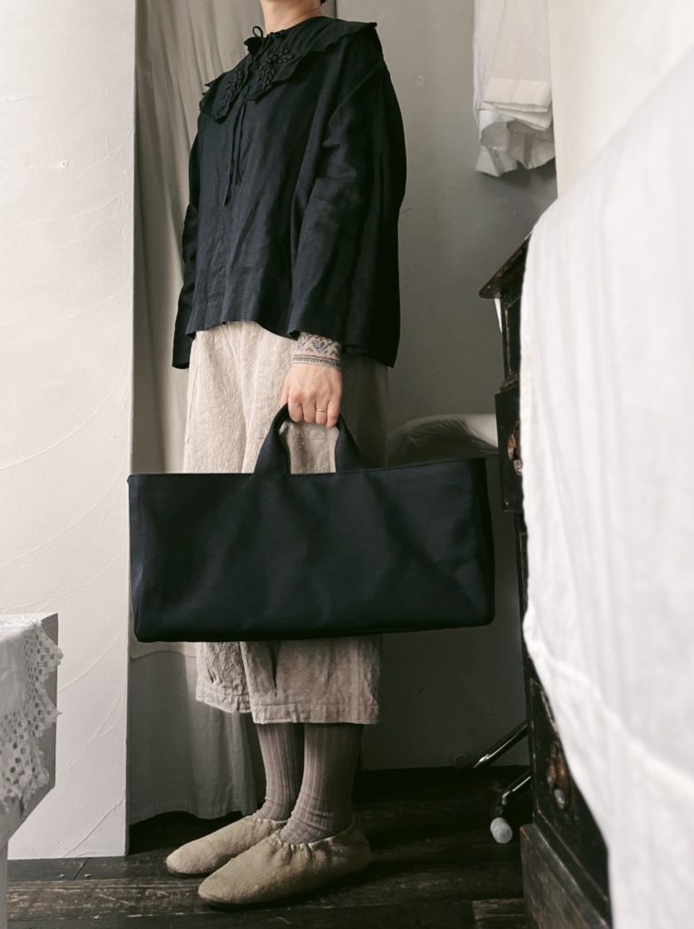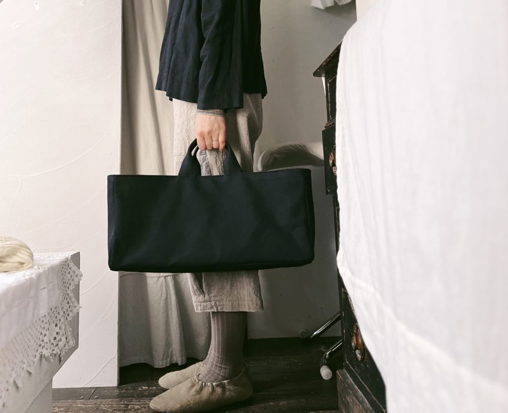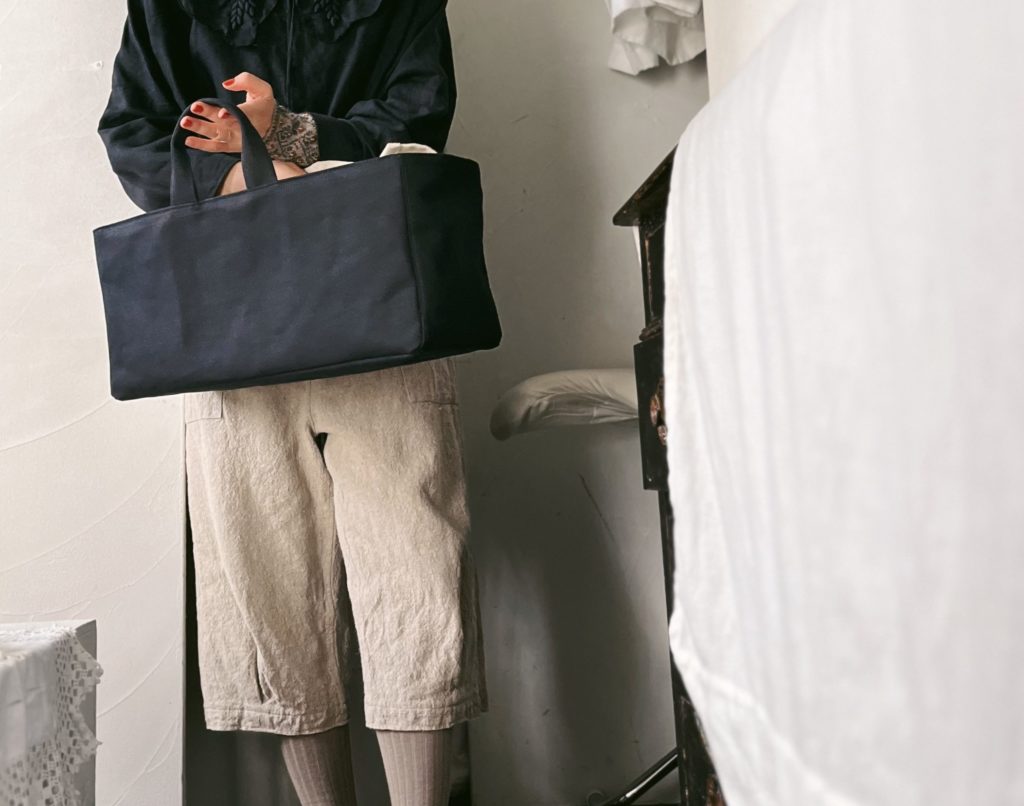 カゴバッグの形を帆布に落とし込んだ面長フォルムの