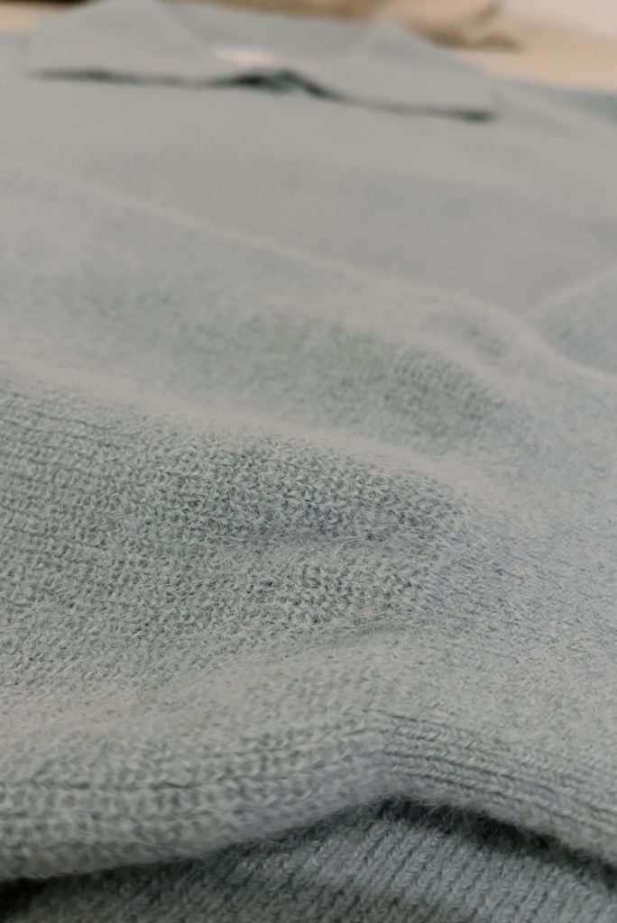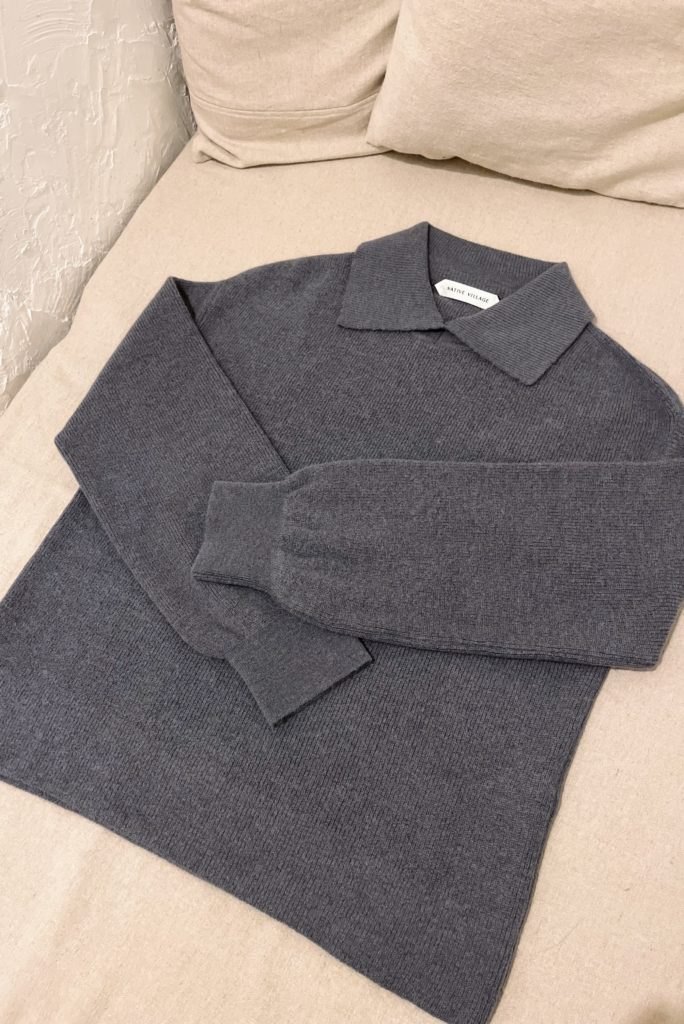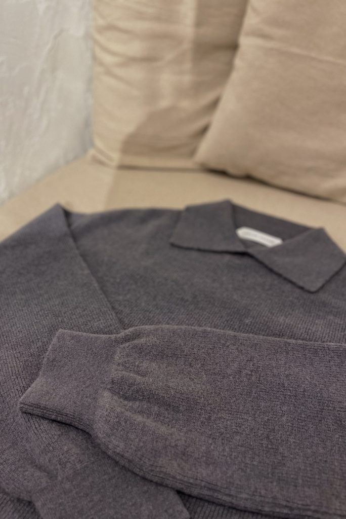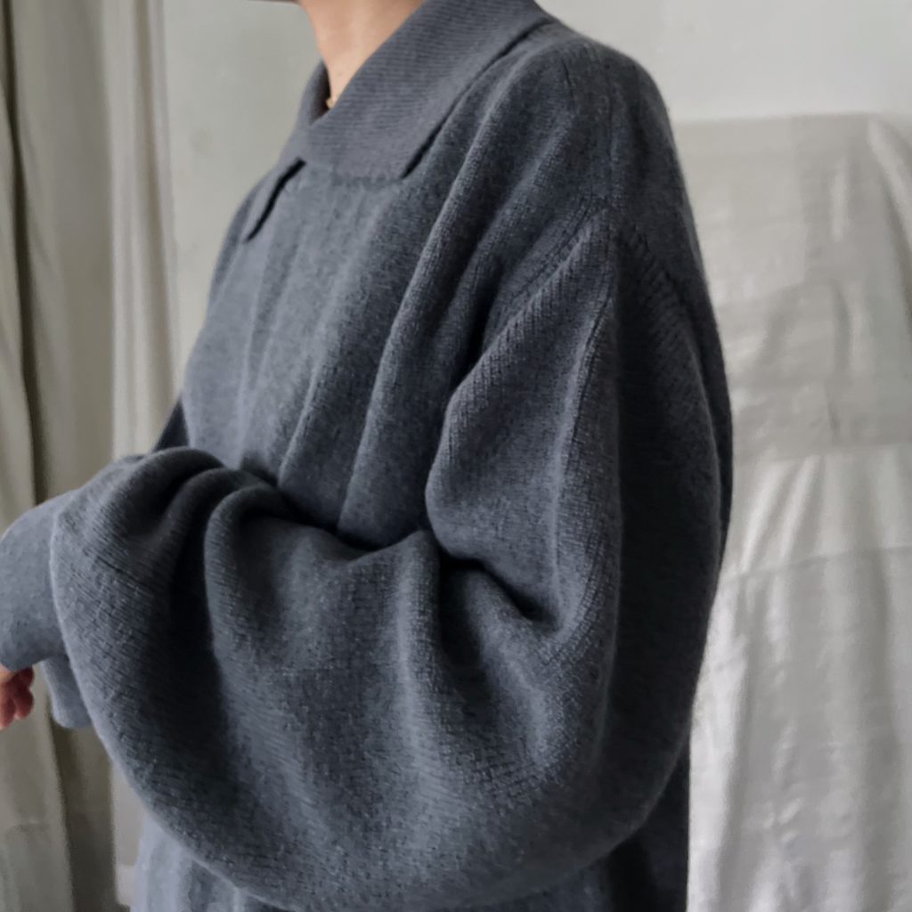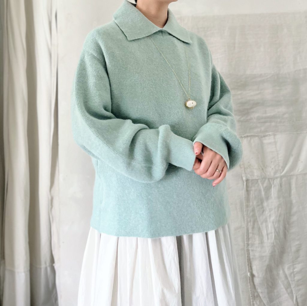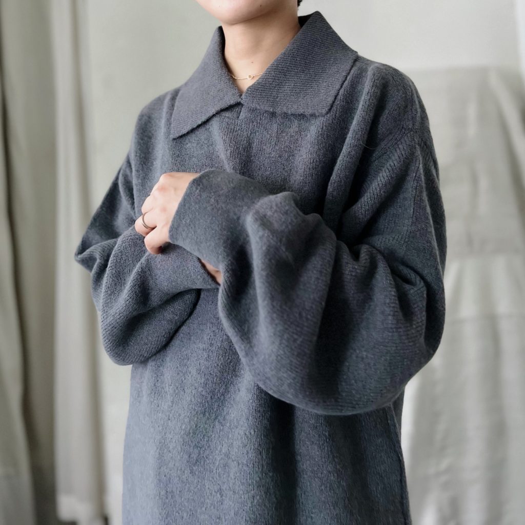 大きな襟元が特徴的なポロセーターです。
