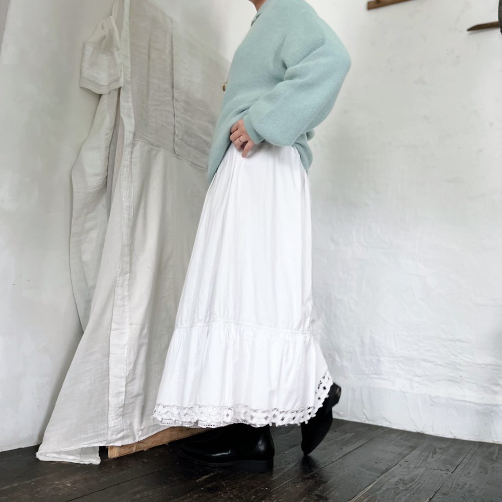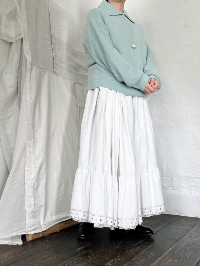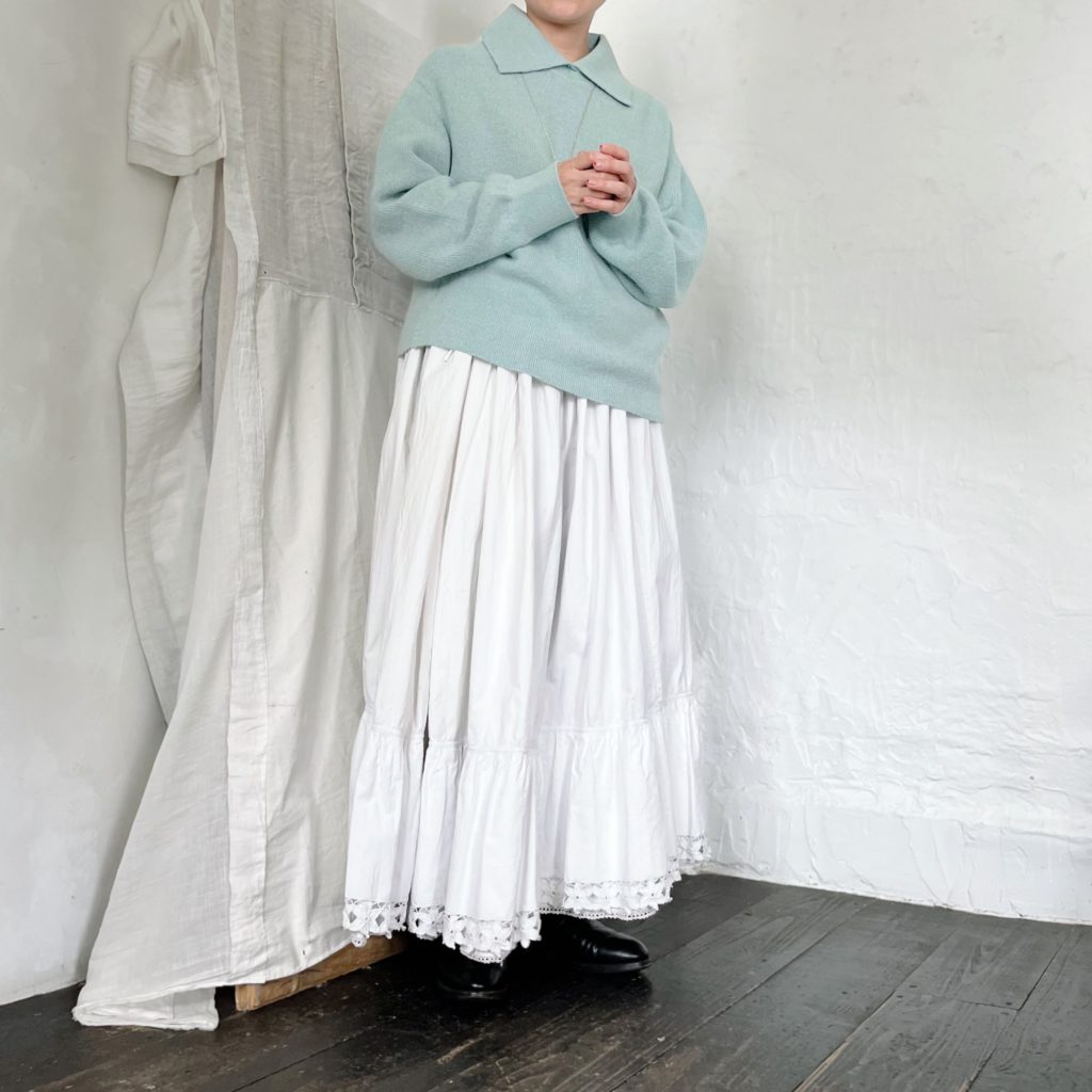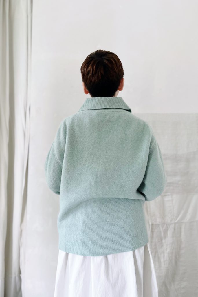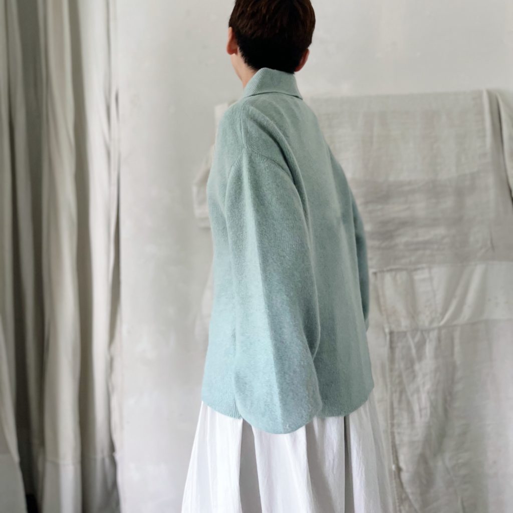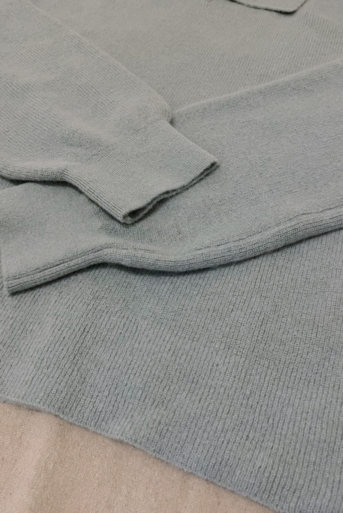ニットは素材の特性上斜行します。一着ずつに寸法に差が出ますのでご了承ください。
